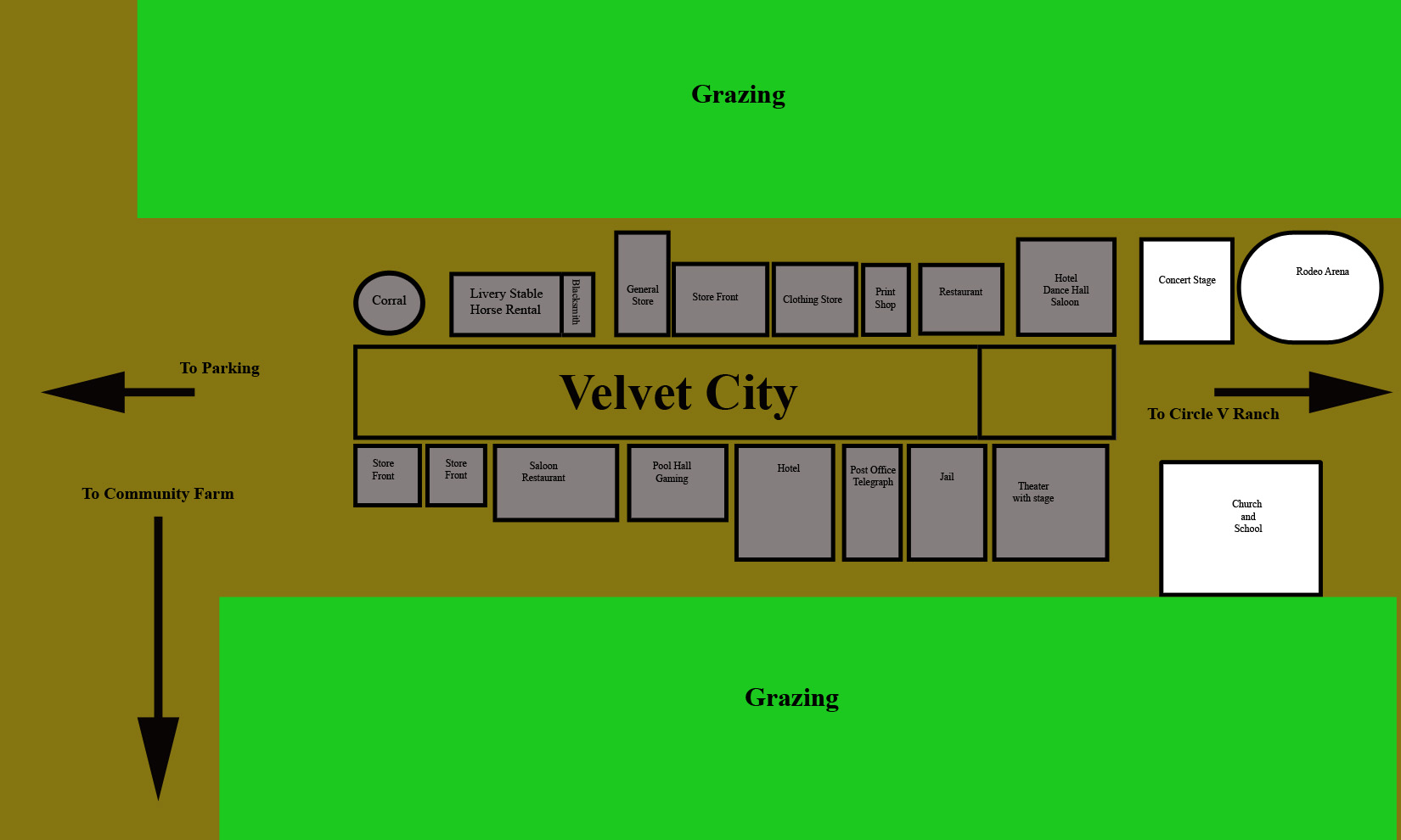 - The Circle V Ranch and Velvet City is a one of a kind ranch, old western town and community farm where visitors can relive the way it was in the old West. At the ranch, you can rent a horse for a trail ride, or go on a guided trail ride; hitch up a buggy and take a leisurely ride down the road or across the countryside; head into town for some authentic western shopping and eat at one of the fine restaurants serving straight from the “farm to the plate.”