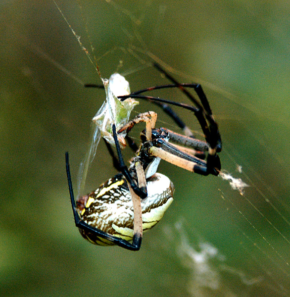 The garden spider will put a web between plants and catch insects that are harmful to your garden for food, so it is a win-win for everyone.