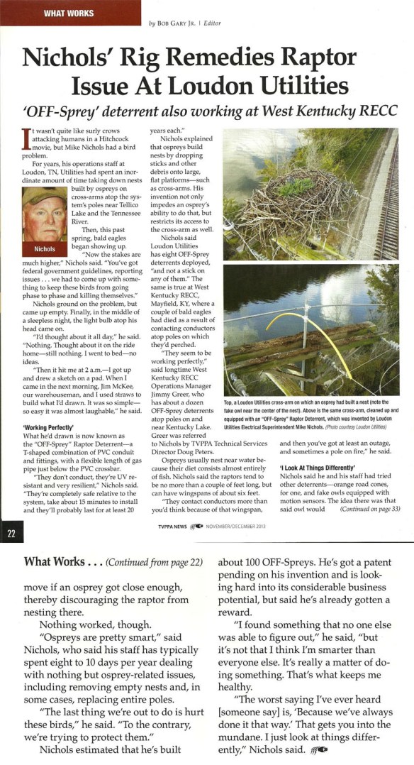 Here is where you can find all of the individual places to get more information and watch videos explaining how to install the “OFF”-Sprey Raptor Deterrent and watch how it prevents a pair of Ospreys to build their nest on top of a utility pole. Make sure to watch both videos on this page.
